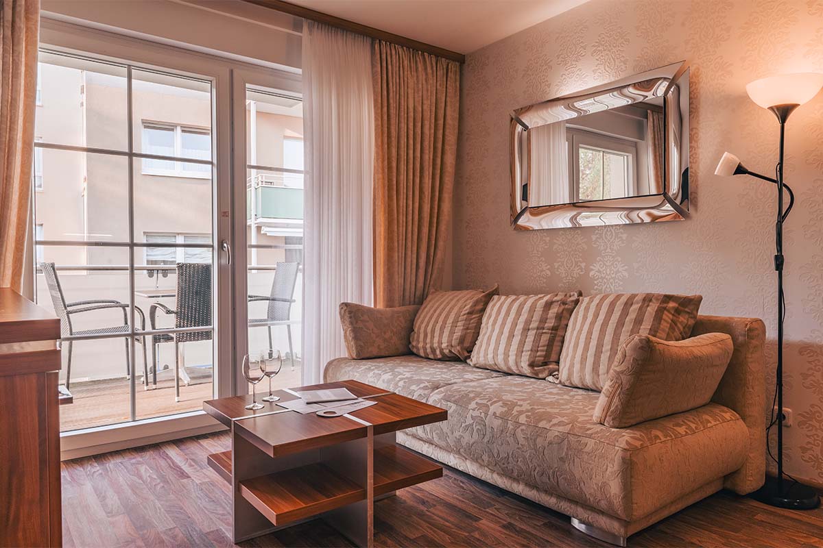 Our modern 32 m² apartments offer separate living and sleeping areas. Each apartment accommodates up to two adults and two children under the age of 16, and includes either a balcony or a terrace.